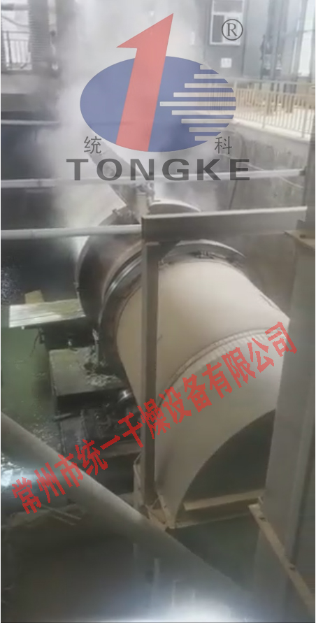 干燥機出來(lái)的物料由于料溫較高,經(jīng)過(guò)螺旋加料器進(jìn)入水冷滾筒冷卻機冷卻。